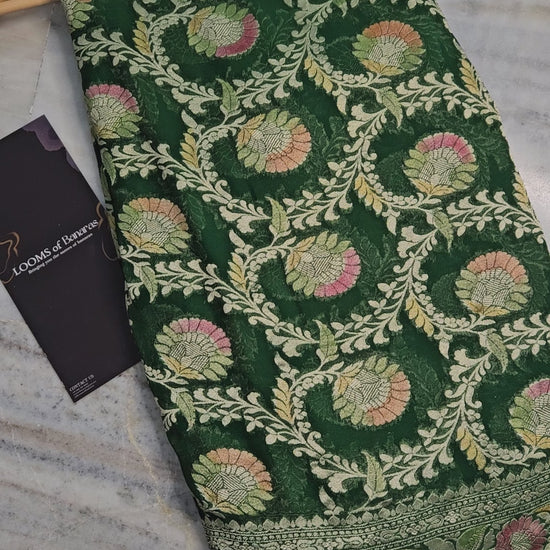 Pure Georgette Banarasi Saree Hand Brush Meena Floral Motifs Work in bottle green