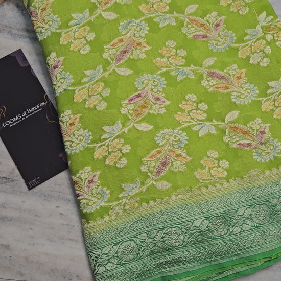 Pure Georgette Hand Brush Meena Work Banarasi Saree in Parrot Green